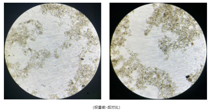 處理后效果:菌劑投加2日后出水降低,5日后出水COD穩定達標,7天后穩定在70mg/L以下,生化系統COD降解能力明顯好轉。